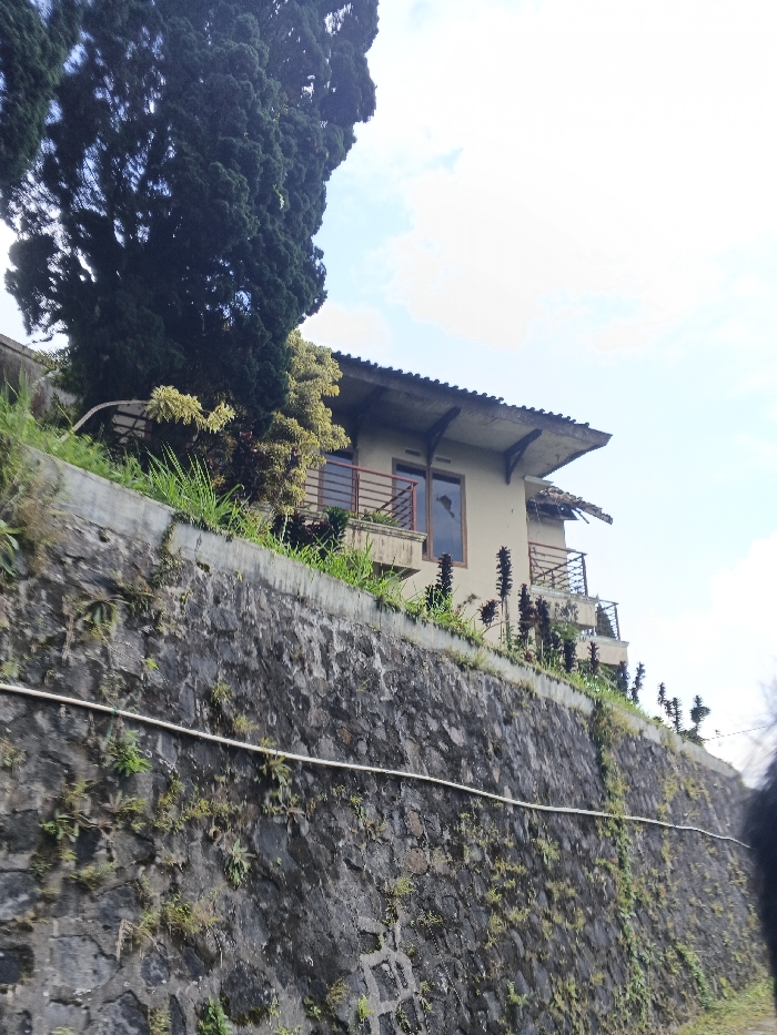 The image depicts an elevated light tan-colored building situated above a prominent retaining wall in Unknown, Cambodia. The retaining wall, constructed from dark grey, irregular stones, is heavily overgrown with moss and various small plants. A white conduit or pipe runs horizontally across the middle section of this wall. Above the retaining wall, a concrete ledge supports a strip of green grass and dark, columnar plants. The building features a significant roof overhang supported by dark brackets. The upper visible floor includes a balcony with a reddish-brown railing and large windows, one of which exhibits a visible crack. To the right, a lower balcony with a similar railing is present, alongside a partially damaged or incomplete roof section protruding from the building. A tall, dark green coniferous-type tree dominates the upper left side of the frame, extending above the building. Lighter green and yellowish foliage is also visible near the building on the left. The sky above is blue with scattered white clouds. No individuals, explicit actions, or interactions are discernible within the scene. The image is captured from a low-angle perspective, looking upwards towards the structures.