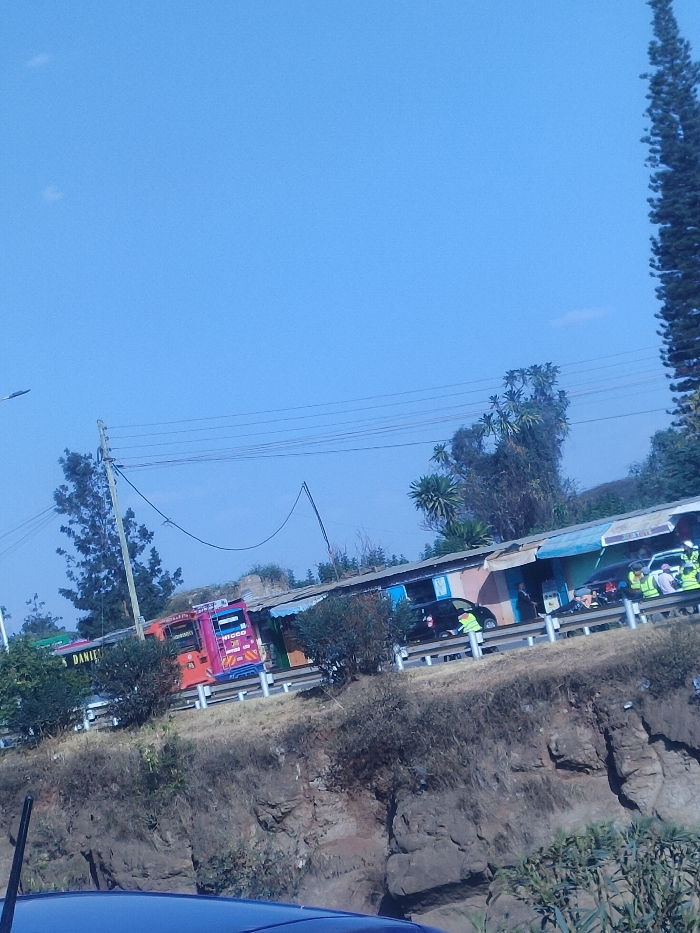 A daytime scene features a street with colorful buildings and vehicles. A bus with "NICCO" on its side is parked near the buildings. Several individuals wearing bright yellow vests are standing by the cars, possibly directing traffic or attending to a situation. A tall pine tree stands to the right of the image. The sky is clear and bright. Below the street is a rocky embankment with sparse vegetation.