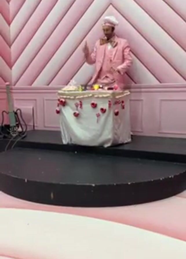 DJ standing behind a table covered with a white cloth, performing on a small, black stage. The DJ is wearing a pink suit with a bow tie and a chef's hat. The table is decorated with red ornaments and musical notes. Behind the stage is a pink and white striped wall with paneling. To the left of the DJ, an electric guitar rests on a stand. The base of the platform is light pink with darker pink accents. The DJ is actively using DJ equipment on the table, gesturing to the side, and adjusting controls. The music playing has a techno beat.