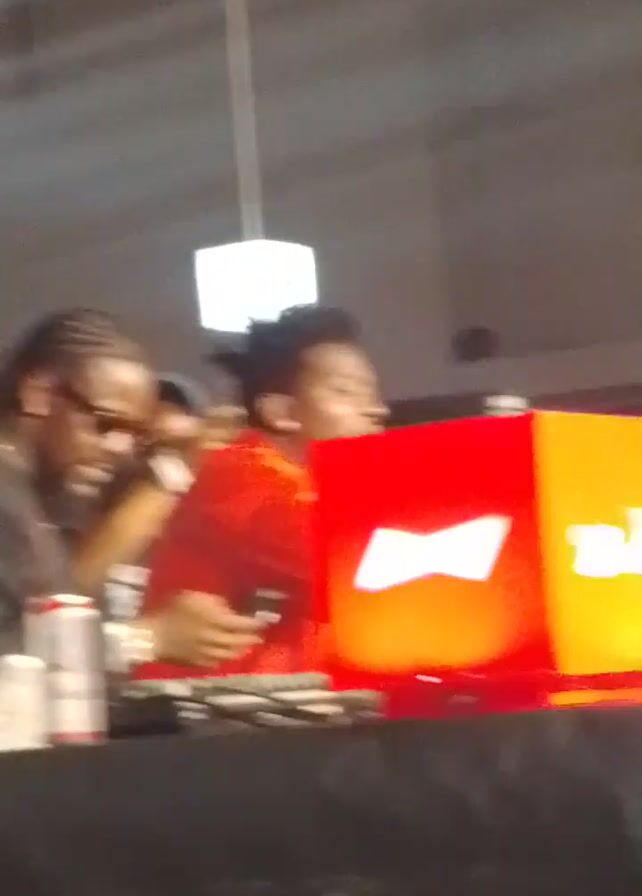 two men standing on a platform, possibly at a concert or event, with a red-and-yellow neon sign in the background. One man wears a white shirt and a red baseball cap, while the other has on a black shirt and sunglasses. A can of Budweiser is also visible near the second man. Another man is holding a phone, seemingly recording.