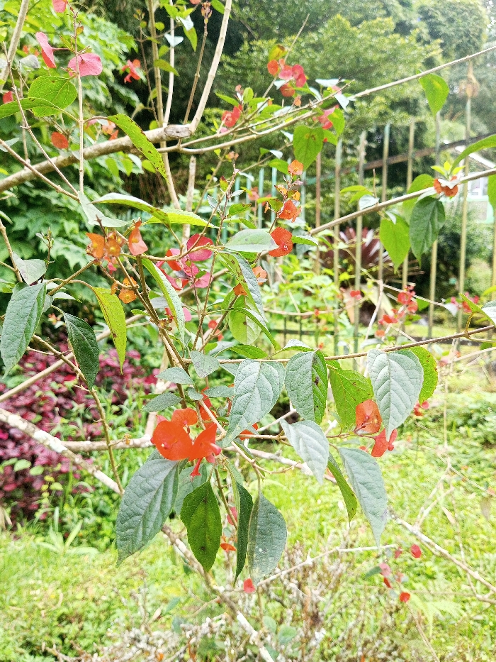 A vibrant Copperleaf plant is in focus. The leaves are varying shades of green and heart-shaped. The flowers are bright orange. The plant's thin brown branches contrast with the lush foliage. The background includes a metal fence, a glimpse of a building, and other green plants and grass. The scene suggests a well-maintained garden or natural area.