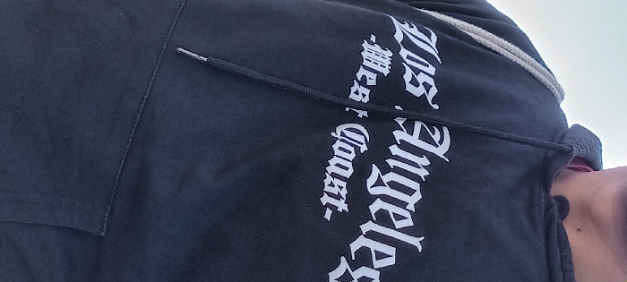 The image presents a close-up, chest-level view of an individual, with the head cropped above the neck. The person is wearing a dark-colored, likely black, hooded sweatshirt. A small, dark mark is visible on the right side of the individual's neck. The sweatshirt displays white text in a Gothic font, reading "Los Angeles" prominently, with "-West Coast-" in smaller text directly beneath it. A black drawstring with metal tips (aglets) hangs from the hood opening, vertically aligned on the chest. The upper seam of a front kangaroo pocket is visible at the bottom of the frame. A light-colored, possibly white or light grey, braided strap or rope is draped over the individual's left shoulder, crossing the upper chest area. The background is uniformly light-toned and featureless, offering no contextual details about the environment. The specific location within the city of Meknès, Morocco, cannot be determined from the visual information presented in the image.