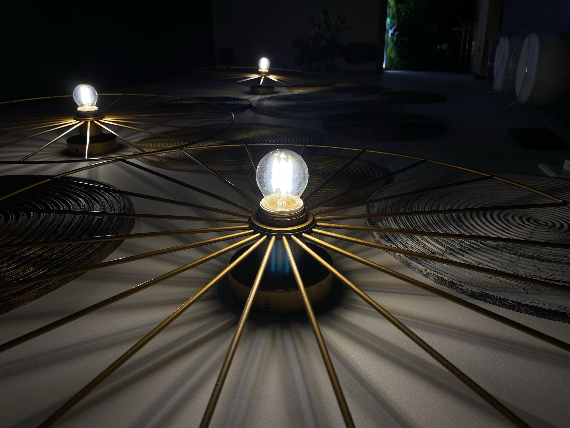 The scene is an interior space in Votkinsk, Russia, featuring a light-colored, textured wall. The wall is adorned with multiple decorative lighting fixtures, with three distinctly visible receding from left to right. Each fixture consists of a central, glowing, clear Edison-style filament bulb housed in a brass-colored fixture, from which numerous thin, golden-colored rods radiate outwards in a wheel or sunburst pattern. These rods cast pronounced radial shadow patterns onto the wall. Circular art pieces with concentric ring patterns in shades of white, gray, and black are mounted on the wall between the spokes of the primary fixture. In the dimly lit background on the right, a dark surface holds a dark vase containing green foliage, and below it, an illuminated aquarium emits a faint green light. Two glass containers holding a white opaque substance are present on a lower surface. No individuals or active interactions are depicted.