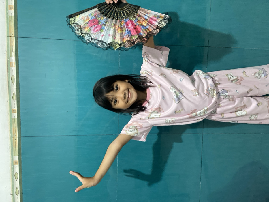 A young girl, approximately 6-8 years old, stands centrally in an indoor setting in Gelam, Indonesia, against a teal-colored wall. She wears a light pink two-piece pajama set featuring repeating cartoon animal patterns. Her left arm is extended sideways and upward, fingers splayed, casting a dark shadow on the wall to her left. Her right hand holds an open, decorative folding fan with a multi-colored floral design on a light background, accented with black lace trim. The girl smiles directly at the camera. Above the teal wall, a horizontal band of light-colored, patterned tiles is visible.