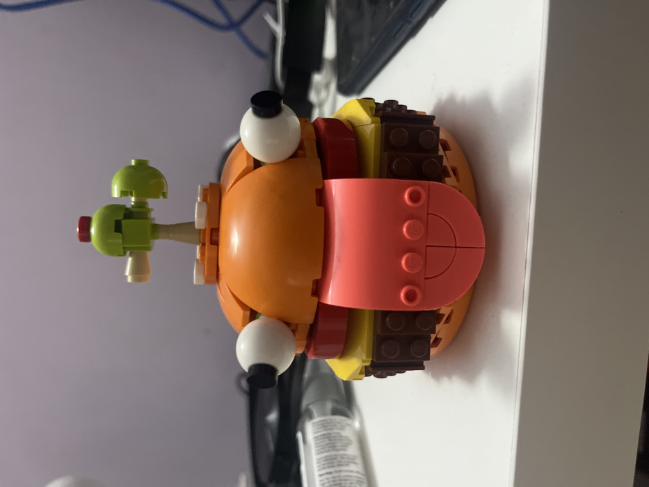 A LEGO-brick model, styled as a cartoonish hamburger with anthropomorphic features, is centered on a flat, white surface