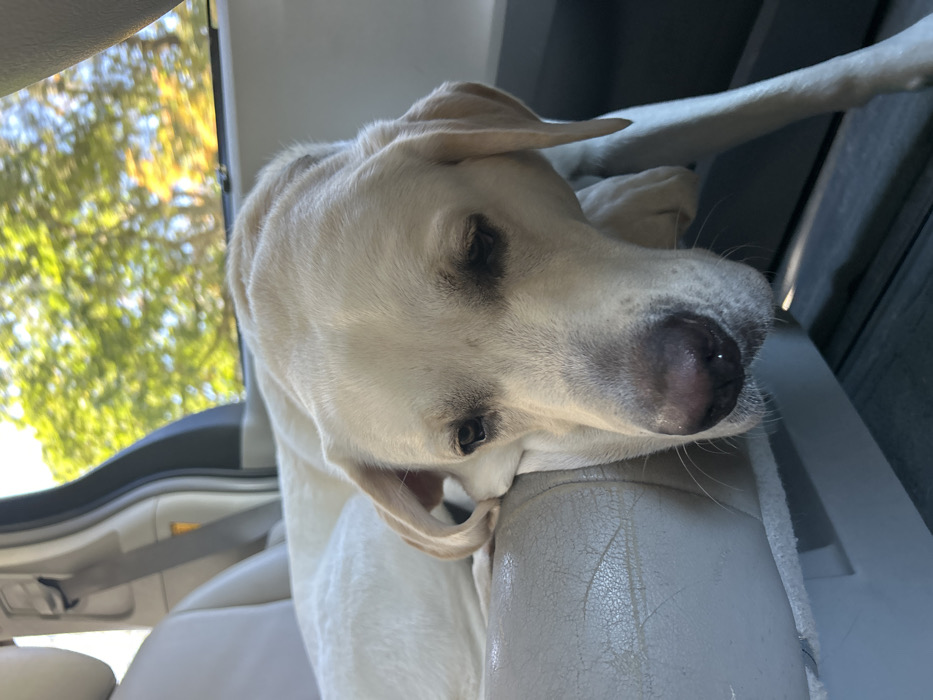 - "A cream or light-yellow Labrador Retriever is depicted lying prone on a light-colored, possibly leather, vehicle seat" by FM-p02Wp2, licensed under CC BY 4.0