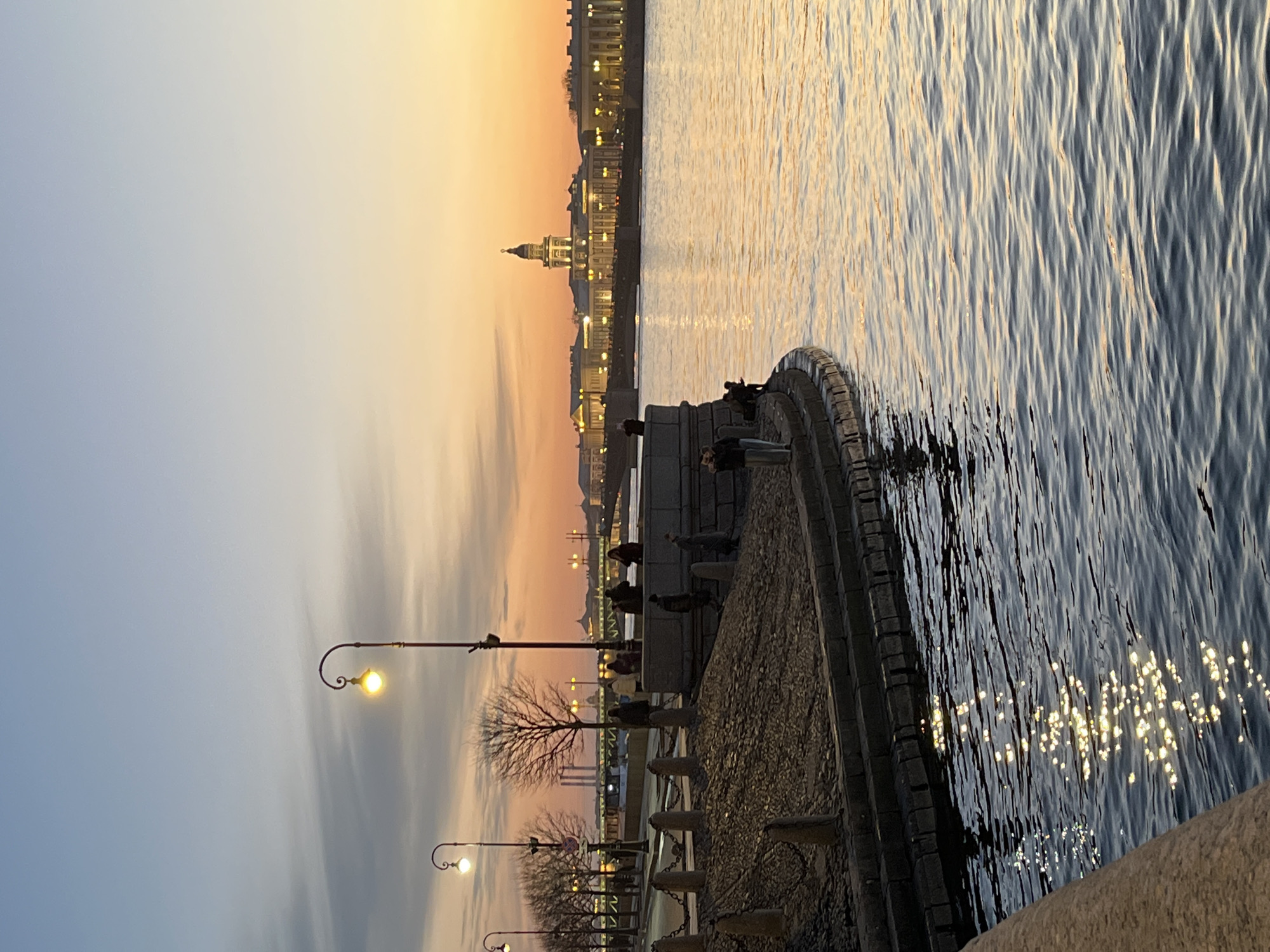 Here's a forensic description of the image: **Setting:** An embankment in Saint Petersburg, Russia, at dusk or dawn. The view is oriented toward a river with buildings lining the opposite bank. **Composition:** The image is a horizontal shot. The lower portion of the frame is occupied by the embankment’s edge, constructed of stone or concrete. People are present on the embankment. Beyond the embankment, water stretches into the distance. Buildings are visible on the horizon, their forms silhouetted against the sky. **Sky and Light:** The sky is a gradient of colors, ranging from light blue to orange, indicating either sunrise or sunset. The water reflects the light, creating a shimmering effect. The buildings are lit by street lights. **Objects:** * Embankment: The edge is made of stone or concrete. * Water: A river, reflecting the sky. * Buildings: Silhouetted against the sky. * Streetlights: Illuminate the embankment and buildings. * People: On the embankment **Actions and Interactions:** * People are standing and sitting on the embankment, possibly observing the view or the water.