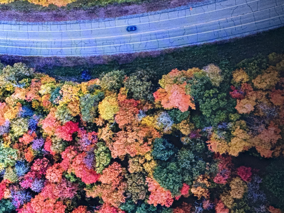 An aerial view depicts a landscape in the city of Slavyanovo, Bulgaria. The left side of the image features a dense forest canopy composed of trees displaying a wide spectrum of foliage colors, including various shades of red, orange, yellow, green, pink, and blue. A narrow band of dark green vegetation separates this forest from a two-lane paved road situated on the right side of the frame. The road, running vertically, presents a bluish-grey surface with visible crack patterns and white lane markings, consisting of a double solid line on the left and a single dashed line on the right. A single dark-colored sedan is positioned on the right lane of the road, moving towards the top of the image. No individuals are visible.