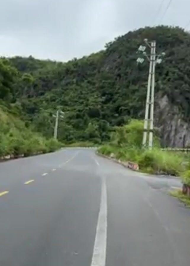 The video depicts a winding asphalt road flanked by lush green vegetation