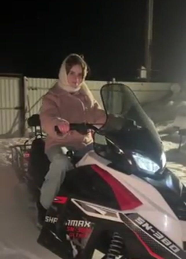 A young woman wearing a headscarf, light pink coat, and jeans sits on a white, black, and red snowmobile. The snowmobile has its headlights on. She is in a snowy area at night, with a fence visible in the background. The camera is static, and the woman is looking at the camera while holding the snowmobile's handlebars. The text "SN-380 ULTRA" is visible on the snowmobile.