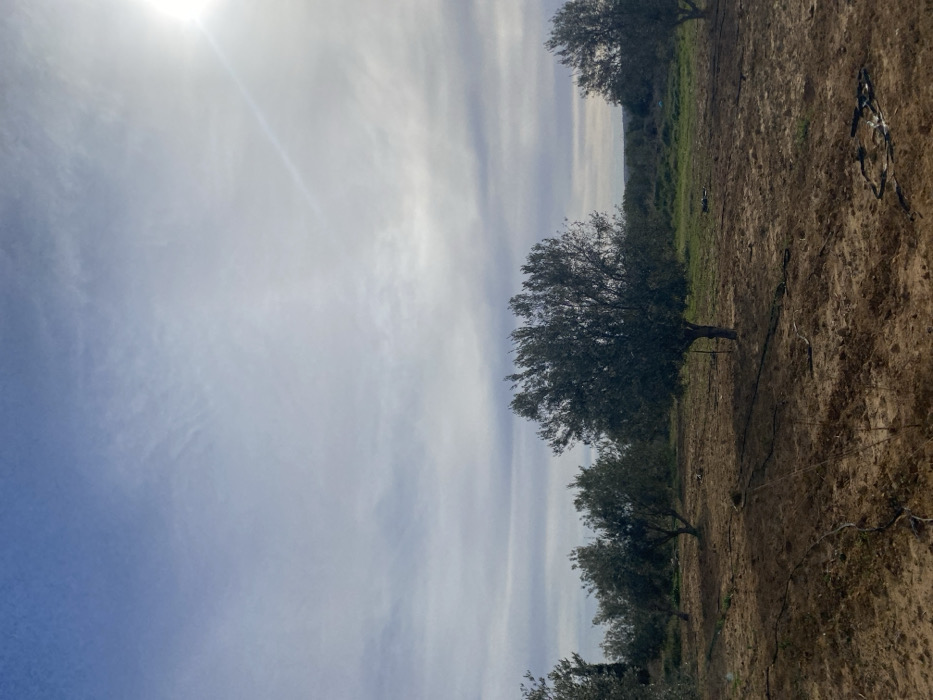 A landscape shows a field with several trees under a cloudy sky with a bright sun. The ground is dry and brown, and some irrigation lines are visible. Trees are scattered across the field. The sky is predominantly light blue with streaks of white clouds. The sun is positioned at the top left corner of the image.