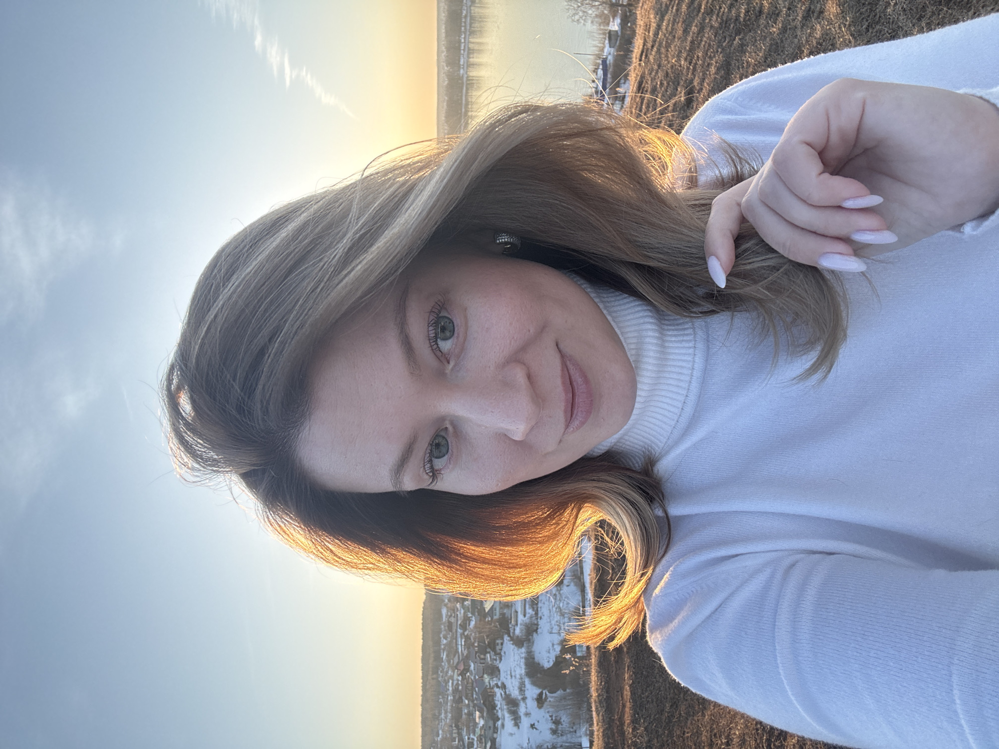 A woman in a white turtleneck sweater takes a selfie outdoors. She has light brown hair and green eyes. The background shows a landscape during sunset, possibly in winter with patches of snow. In the distance, there's what appears to be a town or settlement. The location is suggested to be Ольховка, Russia.