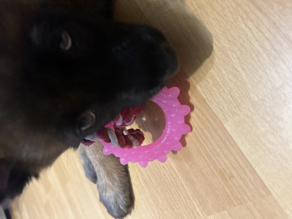 This image depicts a close-up, low-angle view of a young dog, likely a puppy, lying on a light brown wooden floor in Hrabarsko, Bulgaria. The dog has a dark brown to black muzzle and facial fur, with visible lighter tan or greyish fur on its left front paw. Its eyes are partially visible, appearing dark. The dog is positioned with its head near a collection of dog toys. The most prominent toy is a bright pink, translucent, circular rubber or silicone ring with raised, spiky protrusions around its perimeter, designed for chewing. Partially obscured beneath the dog's muzzle and intertwined with the pink toy is a red and white braided rope toy. The dog's muzzle is close to or slightly over these toys, indicating an interaction such as chewing or playing. The wooden floor exhibits distinct grain patterns and plank seams. The lighting suggests an indoor setting, casting subtle shadows from the dog's head and the toys onto the floor.