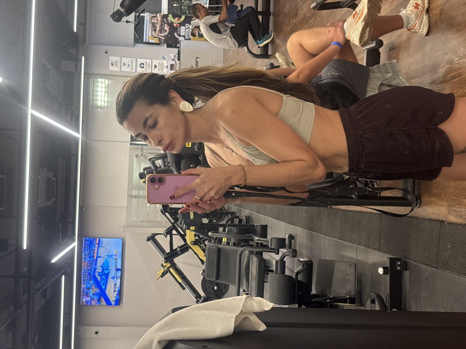 A woman in a light-colored sports bra and dark shorts poses with a cell phone in a gym. She has long brown hair and is wearing earrings. Various exercise machines surround her, and a white towel rests on one. In the background, a man is seated on an exercise machine, and there is a television playing. Gym equipment lines the floor.