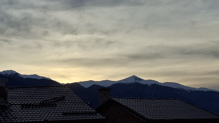 The image displays an elevated view of a mountain landscape in Bansko, Bulgaria, at either sunrise or sunset. The foreground is dominated by the dark, tiled roofs of two buildings. The roof on the left features a distinct dark, possibly scalloped or diamond-patterned tiling. A light-colored chimney rises between the two roof structures, slightly to the left of the image's vertical center. In the midground and background, a range of large, dark mountains with prominent snow caps on their peaks extends horizontally across the frame. A strong, orange-yellow glow is visible on the horizon behind the mountains to the left, indicating the sun's position. The sky above is mostly overcast with textured, grey clouds, transitioning to a lighter, more ethereal tone near the horizon. No individuals, specific actions, or interactions are depicted.