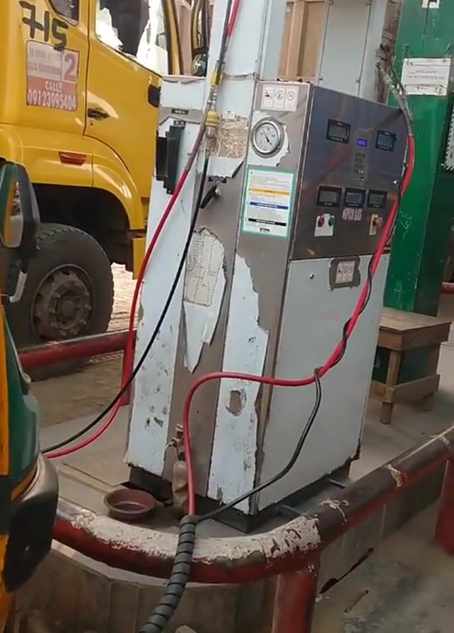 man standing at a gas station next to a filling station. He's wearing a black shirt and gray pants and has money in his hand. The gas station is a large, somewhat dilapidated-looking piece of equipment with a variety of gauges and connections. It is white with a stainless steel front. There are various vehicles in the background, including a yellow truck and a trailer. The station is beneath a corrugated steel roof.