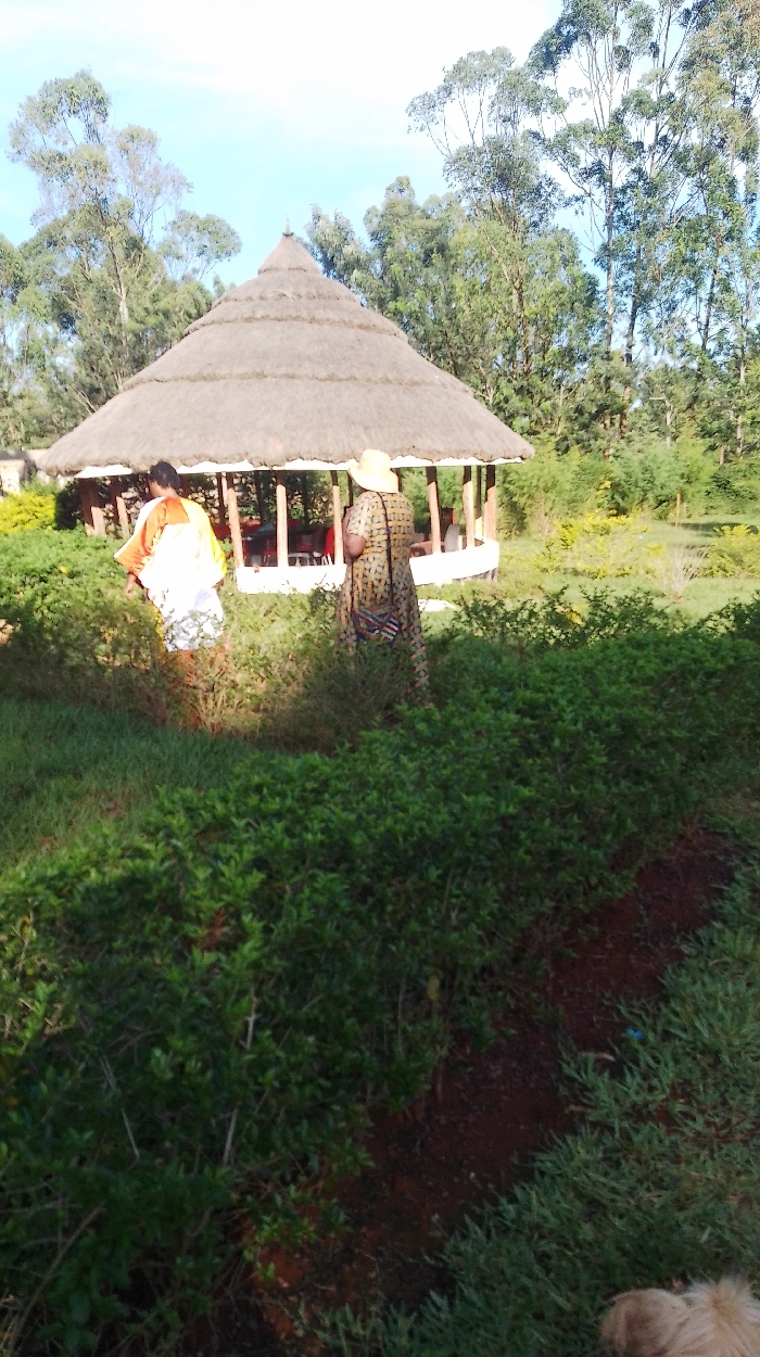 The image displays an outdoor scene in Kisa Central ward, Kenya, under a clear blue sky. In the midground, a circular gazebo-like structure with a multi-tiered conical thatched roof is prominent. The structure features wooden support pillars and a white-painted low wall or railing around its perimeter; red chairs are visible inside. Two individuals are walking away from the viewer towards this structure. The person on the left wears an orange and white garment. The person on the right wears a patterned full-length dress, a light-colored wide-brimmed hat, and carries a multi-colored woven bag slung across their back. The foreground consists of dense green shrubbery and grass, with an exposed reddish-brown earth path running through it. A light-colored, fluffy animal is partially visible in the bottom right corner of the frame. The background is filled with numerous tall, slender trees, and a dark area suggesting a body of water is visible to the right of the thatched structure.