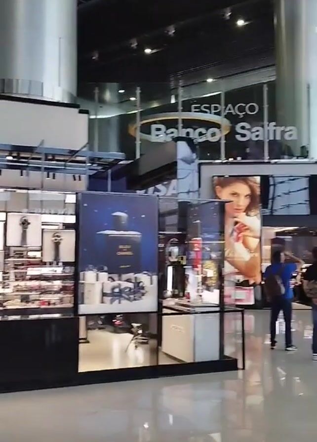 interior of an airport shopping area. Brands such as Chanel, Dior, Visa, and Banco Safra are prominently displayed. People are walking through the area, some with luggage. The lighting is bright, and the floor is reflective.