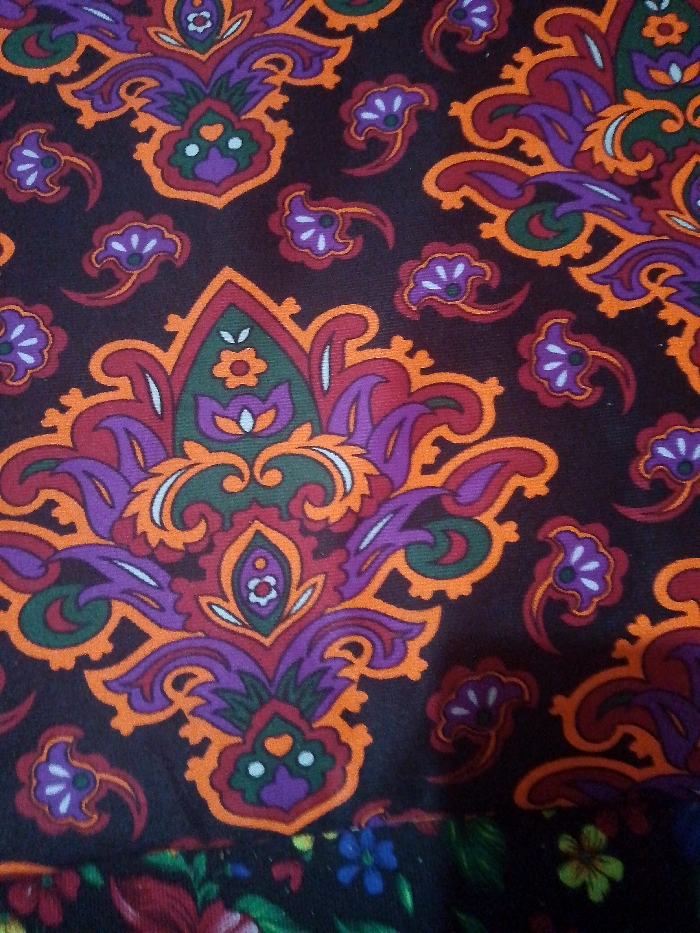 A close-up photograph displays a section of patterned textile, located in Namangan City, Uzbekistan. The fabric features a dense, repeating design of ornate, symmetrical paisley or stylized floral motifs. These primary motifs are outlined in bright orange and filled with vibrant purple, deep red, and dark green segments, accented with small white details. Numerous smaller, teardrop-shaped paisley elements, typically outlined in orange or red with purple or white interiors, are scattered across a dark, likely black or deep brown, background. A narrow strip of a secondary fabric, patterned with red, blue, and green flowers on a dark base, is visible along the very bottom edge of the frame. The textile surface appears smooth and evenly lit. No individuals, actions, or distinct environmental features are present beyond the fabrics.