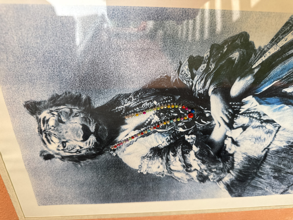 A framed monochrome print shows a tiger lying down. A strand of multi-colored rhinestones decorates the image, arcing across its body. The background is a textured grey. Elements of human portraiture, possibly a woman's face and flowing attire, are subtly integrated with the tiger's form, creating a surreal and captivating visual fusion.