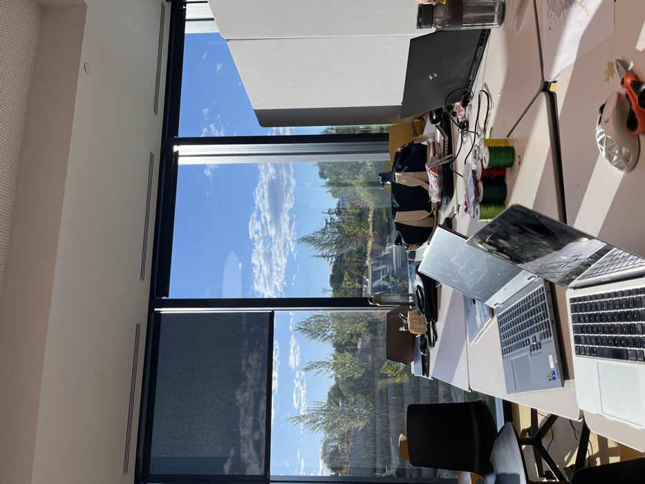 The image depicts a modern, sunlit interior workspace with a large window array overlooking a landscaped urban environment. The location is identified as consistent with the IE University campus at Caleido, Cuatro Torres Business Area, Madrid, Spain, based on the distinctive terraced green area with trees visible beyond the windows and the contemporary architectural style. The external view features a clear blue sky with scattered white cumulus clouds above a dense arrangement of green trees and sloped, terraced landscaping. A large, light-colored structure is partially visible among the trees in the mid-ground. The interior foreground and mid-ground show several white desks configured for collaborative work. On these desks, multiple objects are present: - Three open laptops are positioned: a silver MacBook in the foreground left, a grey HP laptop in the mid-ground left, and a black HP Omen laptop in the mid-ground right. - Spools of green, red, and yellow thread are centrally located on a desk. - A white gaming mouse and orange-handled scissors are on the rightmost desk. - Two water bottles are visible: one clear with a grey cap on the right, and another dark metal bottle further back. - A black duffel bag with beige handles rests on a central desk section. - Other items include a small woven basket with pens, a brown leather pouch, various cables, and notebooks. - A black office chair with a yellow seat is prominent on the left. - A tall, light-grey acoustic panel functions as a desk divider on the right. - One window panel on the far left has a dark grey roller blind partially lowered. No individuals are present in the frame. The scene is illuminated by natural sunlight, casting distinct shadows on the desks.