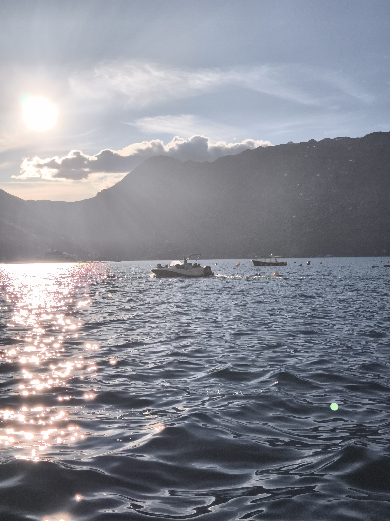 The image captures a serene scene in Perast, Montenegro, featuring a vast expanse of water under a partially cloudy sky. The sun, positioned high in the frame, casts a shimmering reflection across the water's surface, creating a sparkling effect. In the middle ground, two motorboats are visible, with people aboard one of them. The boats are navigating the calm waters. Buoys are floating in the water around the boats. In the background, the silhouette of mountains adds depth to the composition. The overall tone of the image is tranquil, highlighting the natural beauty of the Montenegrin coast.