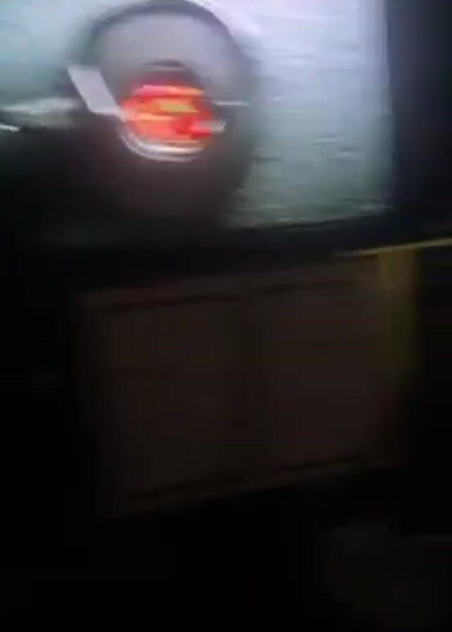 A dark, top-down shot shows a television screen displaying an image of a teapot with liquid inside, with red and orange coloring. The teapot is centered on the screen. The screen appears to be in a dark room, as the surrounding environment is dark. Below the screen, there is a white cabinet with two doors and silver handles.