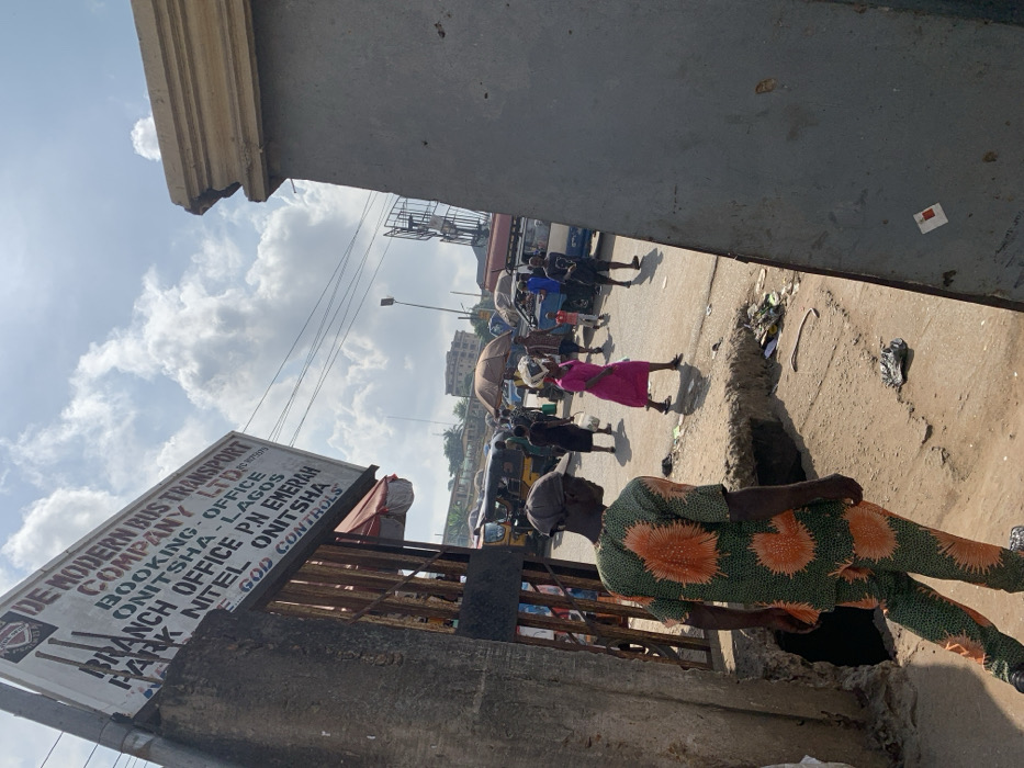 The image depicts a bustling street scene in Onitsha, Nigeria, specifically near the "DE MODERN BUS TRANSPORT COMPANY LTD" office, as indicated by a prominent white sign