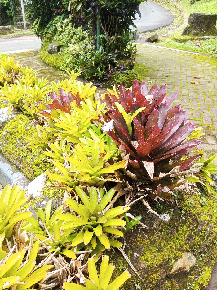 The scene depicts an outdoor landscaped area in Kanand, India. In the foreground, a dense arrangement of bromeliad-type plants is visible. A prominent plant on the right features dark red leaves with lighter green bases and reddish speckles, while numerous adjacent plants exhibit bright yellowish-green foliage. These plants are situated within or upon natural rock formations heavily covered in vibrant green moss. A grey concrete curb is partially visible along the left edge of the plant arrangement. A paved pathway, composed of rectangular or square blocks, begins in the mid-ground, showing patches of green moss, and curves towards the upper right background. Further into the background, a dark grey asphalt road or path curves into view on the left. Lush green vegetation, including various shrubs and tree trunks, forms the backdrop of the scene. No people, animals, or dynamic actions are present.