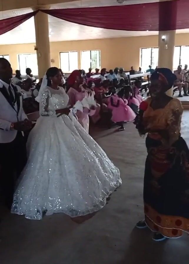 The scene captures a wedding reception inside a spacious hall. A bride in a sparkling, full-length white gown stands beside a man in a light gray suit. They are positioned near the center of the room. A woman in a gold and dark blue outfit, adorned with a headwrap, stands opposite the bride, holding a microphone and seemingly speaking or singing. In the background, rows of seated guests are visible, and some young girls in pink dresses are moving around. The hall is decorated with maroon fabric draped from the ceiling and supported by pillars. Windows are lined along the wall, providing natural light. The floor appears to be a light gray concrete.