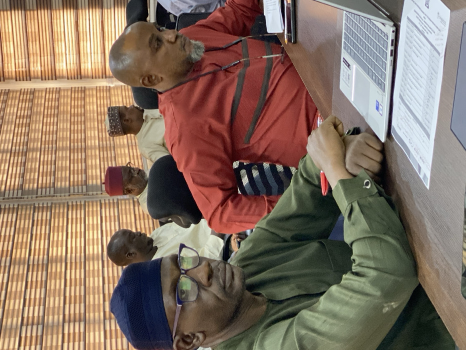 The image depicts an indoor meeting or conference setting in Unguwar Rimi, Nigeria, featuring multiple adult males seated around a dark-stained wooden table