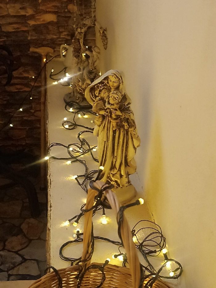 An interior view in Tbilisi, Georgia, captures a decorative arrangement on a ledge. Dominating the scene is a statue of a light-colored material, likely resin, depicting a robed woman holding an infant, positioned centrally on a white-painted ledge. Behind this, further left, are additional decorative elements including a pitcher-shaped vessel and other smaller statues featuring draped figures and grape cluster motifs. A string of warm white LED lights with dark wiring is draped over and around these items and the supporting ledge, extending downwards. To the left of the ledge, a wall constructed from irregularly cut natural stones is visible. To the right, a plain, light-toned wall forms the background. In the lower foreground, a portion of a light-brown woven wicker basket is present, also adorned with sections of the string lights. The environment is dimly lit, primarily illuminated by the numerous small bulbs of the string lights. No human subjects are visible. The objects are static.