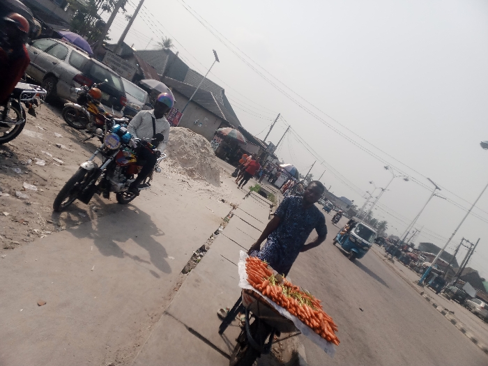 A vibrant street scene features a man selling carrots from a cart on a sun-drenched roadside. Another man on a motorcycle is nearby. Cars and motorcycles populate the street, while pedestrians walk along the sidewalk. Buildings and utility poles line the street, indicating a bustling urban environment. The sky is bright and slightly hazy.