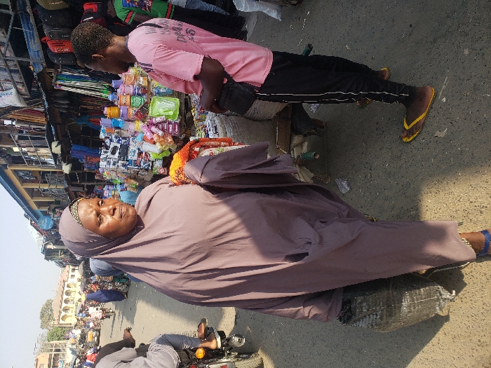 The image captures a market street scene in Suleja, Nigeria, under bright daylight