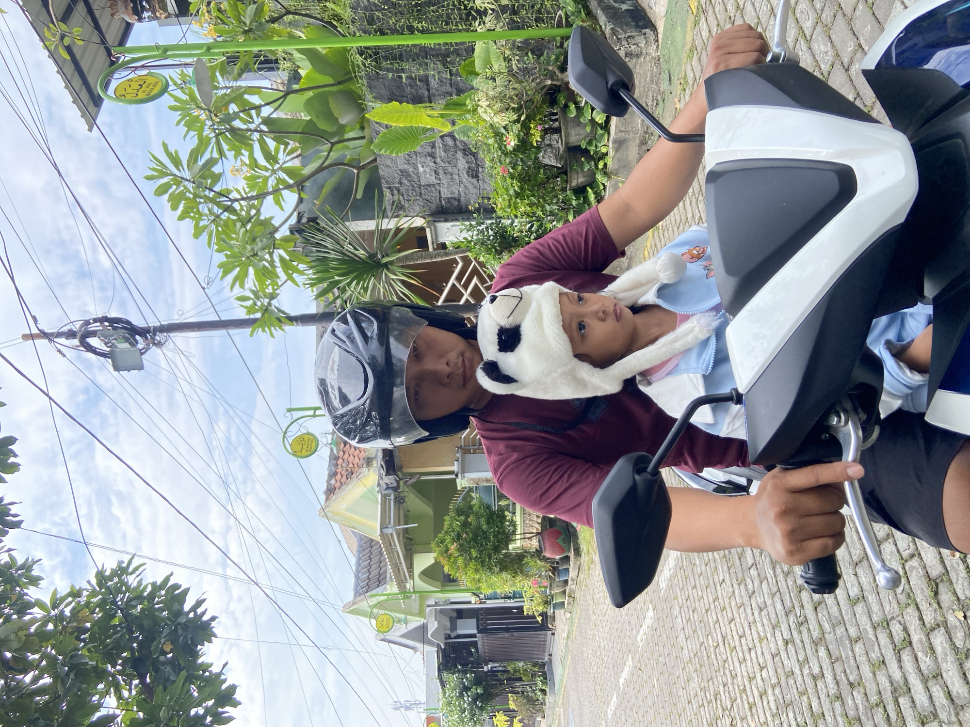 An adult male operates a white and dark blue motor scooter with a young child passenger on a paved street in Gelam, Indonesia. The male, wearing a maroon t-shirt, dark shorts, and a black full-face helmet, grips the handlebars, with his right index finger positioned on the brake lever. The child, seated in front of the driver, wears a white panda-themed hat and a light blue zippered jacket, looking forward with a neutral expression. The street is paved with light-colored rectangular interlocking bricks, with sparse vegetation growing in the cracks. In the background, single-story residential houses are visible, featuring pitched tile roofs; some are painted light green and yellow, while one house presents a dark grey textured facade. Lush green vegetation, including potted plants and garden foliage, lines the street and house fronts. Overhead, numerous electrical wires crisscross against a partially cloudy blue sky. A wooden utility pole with a junction box is present on the right, and green circular signs with Arabic script (identifying "Al Adl" and "Al Rashid") are mounted on green posts along the road. The scene is illuminated by bright daylight.