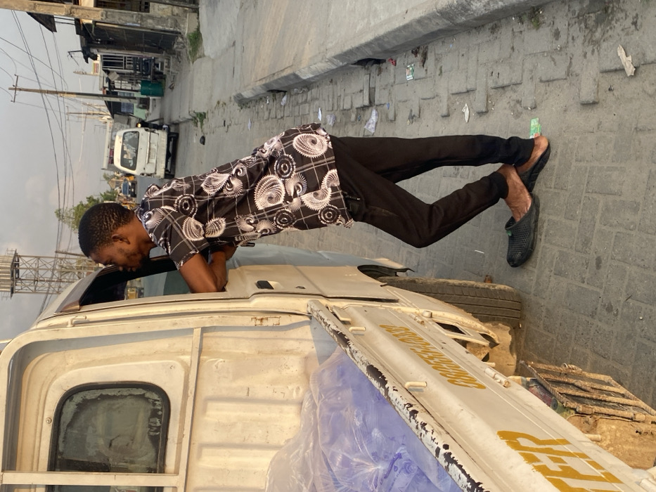 A man wearing a patterned shirt and dark pants stands atop a white truck. He bends over, looking into the truck's cabin. The vehicle appears to be in a state of disrepair. The street is visible in the background, showing a curb and some litter, as well as another truck parked further down. Overhead power lines are also visible.