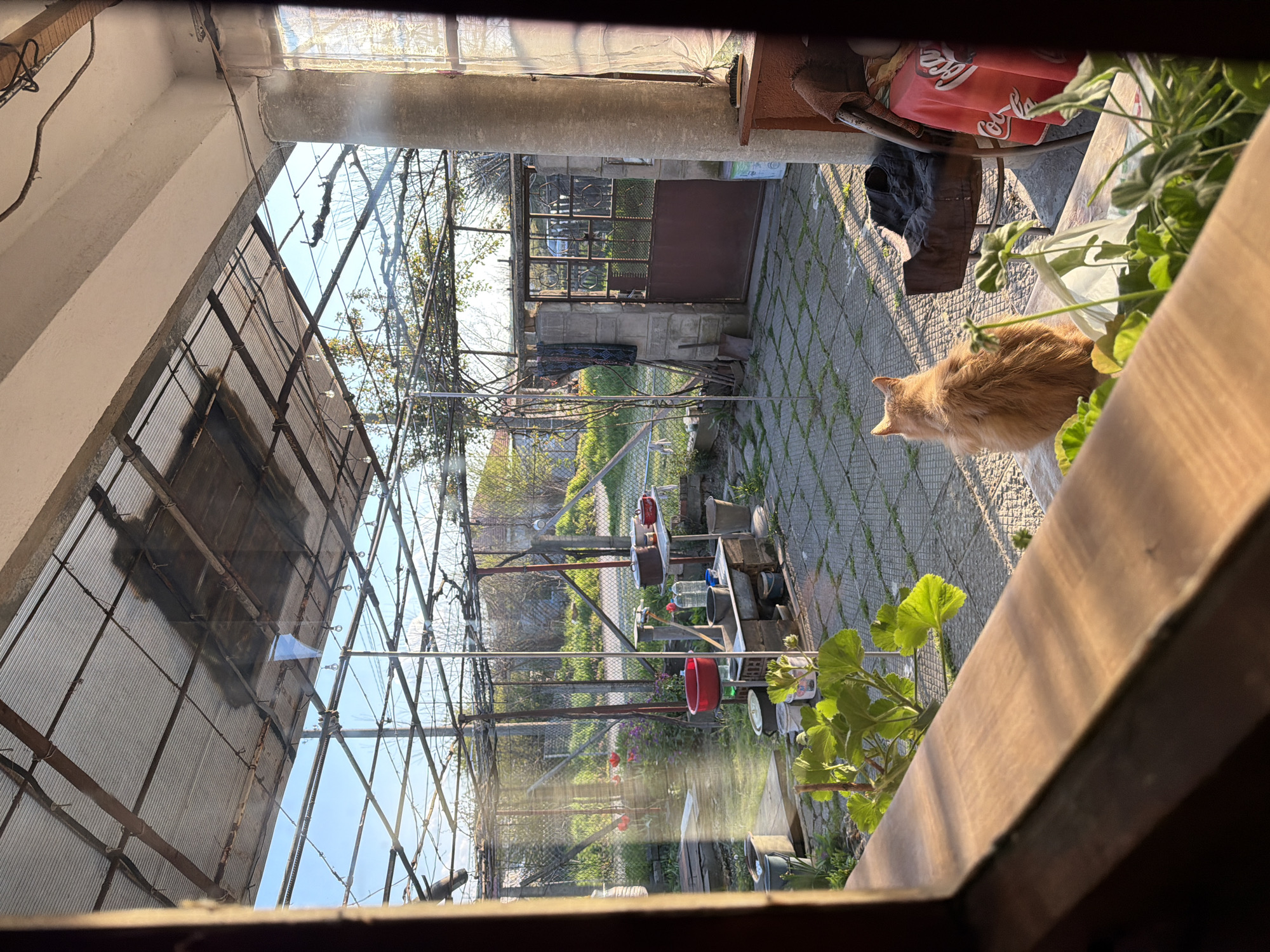 Captured from an indoor perspective, the image presents an exterior scene in what appears to be Grozdiovo, Bulgaria, as indicated by other information. The viewpoint frames an aged greenhouse or conservatory structure with a metallic framework, partially covered with translucent panels allowing diffused sunlight to penetrate. Beyond the greenhouse, a yard or garden area is visible, featuring a stone-paved pathway leading towards a metal gate set within a concrete or stone boundary wall. The garden contains vegetation and various objects, including containers and what may be gardening tools. The foreground is dominated by an indoor windowsill or ledge, which is overgrown with plants. An orange cat is present, positioned among the plants and close to the window frame. Its back is visible to the viewer. The lighting suggests it may be late afternoon with relatively strong sunlight.