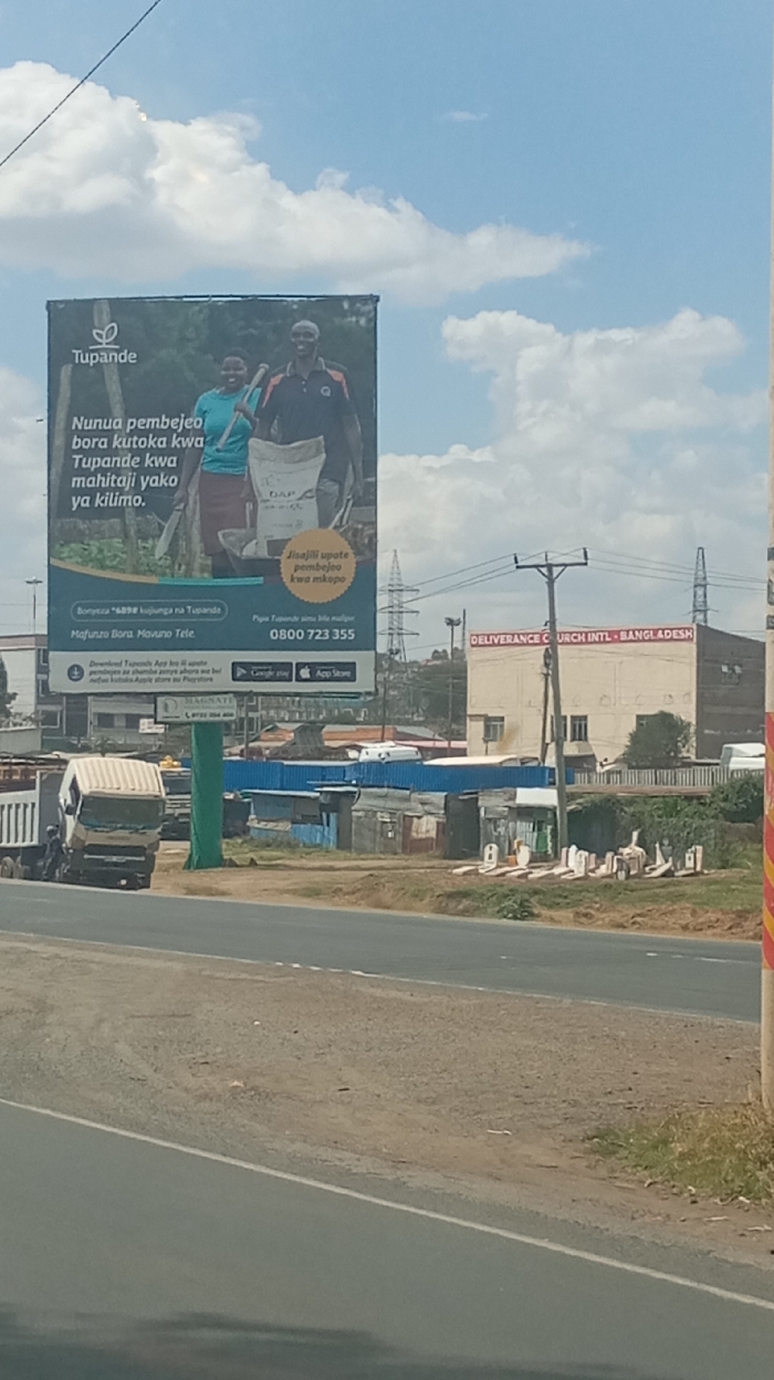 "Tupande" billboard, advertising agricultural inputs. A man and woman are depicted carrying farm supplies. The billboard includes text in Swahili promoting buying better farm inputs through Tupande. It also mentions opportunities to receive credit for inputs and a toll-free number. A truck passes on the road below. A building labeled "DELIVERANCE CURCH INTL - BANGLADESH" is visible in the background, along with overhead power lines.