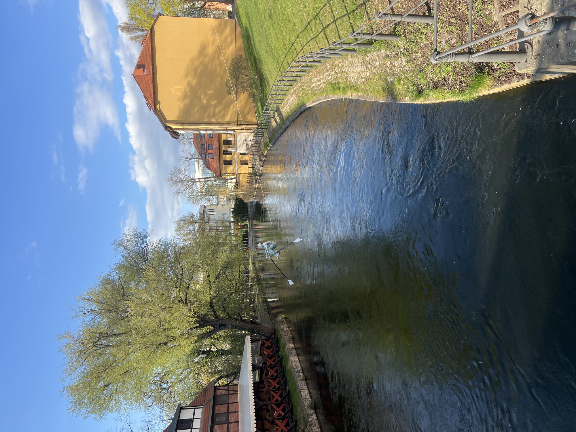 The image captures a canal scene in Bydgoszcz, Poland. The waterway is lined with a stone embankment and a mix of grassy areas and buildings. A prominent yellow building stands along the canal, reflecting in the water. On the opposite bank, there's a structure with visible red and black architectural details and a white awning. A sculpture of a rower is visible in the canal. The sky above is blue with scattered white clouds. A metal fence runs along the top of one of the embankments.