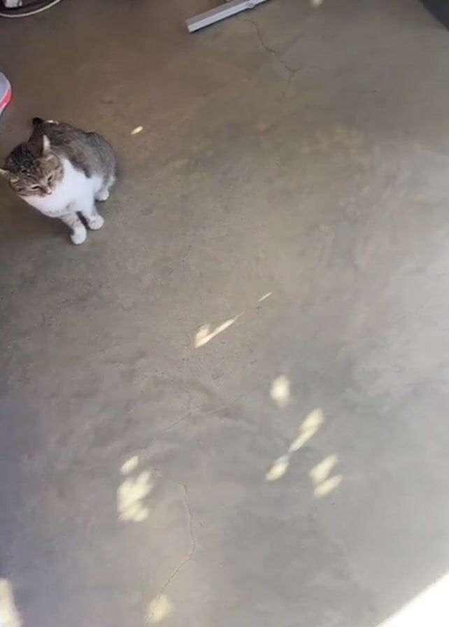 The camera pans across a concrete floor to an open door with a "WELCOME" doormat. The shadow from the open door creates a strong diagonal line across the floor. A cat sitting near the open door watches something outside. A person stands near the cat at the beginning of the video. The floor also has some scattered objects and leaf shadows.