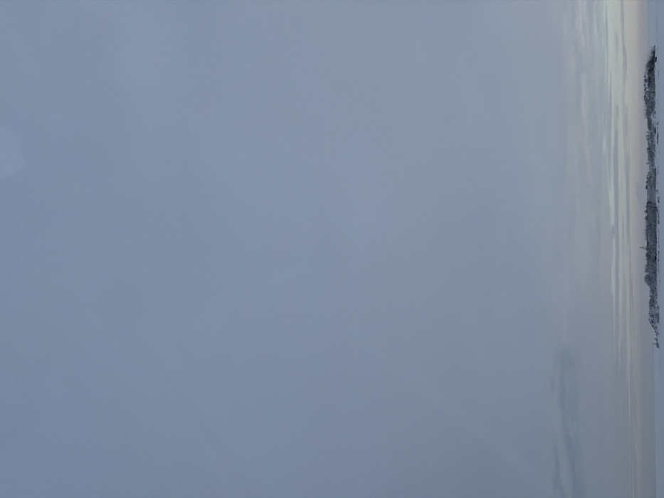 The image displays a panoramic, distant view of a winter scene in the vicinity of Kronstadt, Russia, likely overlooking the frozen Gulf of Finland. The upper approximately 75% of the frame is occupied by an expansive, uniform light blue-grey sky, indicative of overcast conditions or significant atmospheric haze, with subtle, lighter horizontal cloud formations visible towards the horizon line, particularly on the left. The lower approximately 25% of the frame consists of a flat, unbroken white expanse, consistent with a snow-covered frozen body of water or ice. At the extreme bottom of the image, positioned slightly to the right of center, a low-lying, elongated landmass is visible. This landmass, identifiable as one of the fortified islands or a distant shoreline characteristic of the Kronstadt area, features dark, sparse vegetation, likely bare or snow-dusted trees, and indistinct structural outlines. A singular, slender, vertical structure, possibly a lighthouse, monument, or communication tower, stands prominently on the landmass, positioned slightly to the left of its horizontal midpoint. No individuals, animals, or active subjects are discernible within the frame. The scene is static, presented under diffuse natural light.