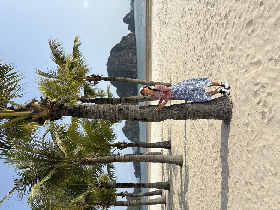 A single female subject stands on a sandy beach in Ha Long Ward, Vietnam. She is positioned to the right of the central axis, facing the camera, with her arms wrapped around the trunk of a tall palm tree. Her expression is a smile. She is wearing a light-colored baseball cap, a long-sleeved top with a pink, orange, and white abstract pattern, a knee-length blue skirt with a white dotted pattern, and dark sneakers with white and blue accents. Her left foot is partially lifted, with the toe touching the sand. The beach consists of light-colored sand, displaying shadows from multiple palm trees. A row of similar tall palm trees extends diagonally across the midground from left to right. Beyond the beach, a calm body of water, likely a bay, is visible. In the background, numerous vegetated limestone karst islands of varying sizes rise from the water under a clear, light blue sky. A faint linear structure, possibly a net or poles, is visible in the water on the far right horizon.