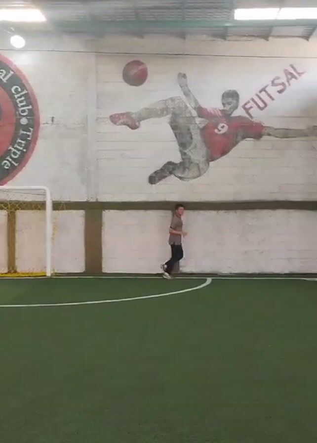 A young man is practicing soccer in an indoor futsal club. He is wearing dark pants and a gray shirt, and he kicks the soccer ball. The wall behind him has a mural of a soccer player doing a bicycle kick, with the word "FUTSAL" next to him. To the left of the man is a soccer goal with a yellow net. The turf is green, and there are white lines indicating the boundaries of the field. The facility has a high ceiling with bright overhead lighting. There is also a logo on the wall that reads "Triple Nine Futsal Club."