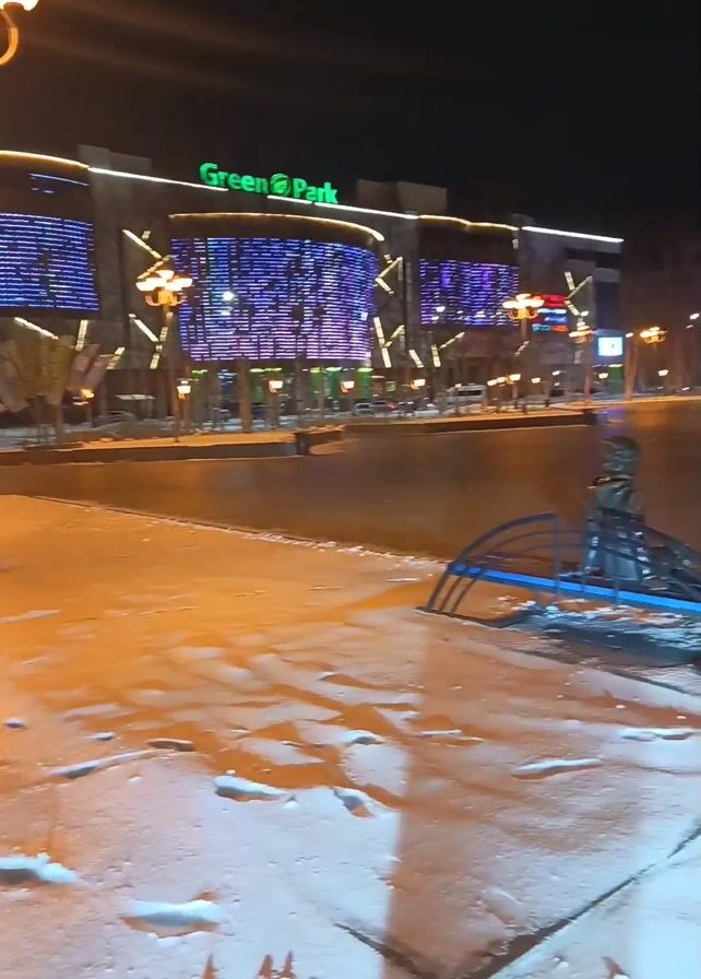 nighttime view of a snow-covered area near a "Green Park" building. The ground is partially covered with snow, revealing patches of wet surfaces underneath. A blue metal structure rests on the snow-covered ground in the foreground. The "Green Park" building is visible in the background, illuminated with bright green and blue lights. Streetlights line the area and buildings can be seen in the distance, adding to the overall illumination of the scene. Footprints are visible in the snow. There are no people visible in the video.