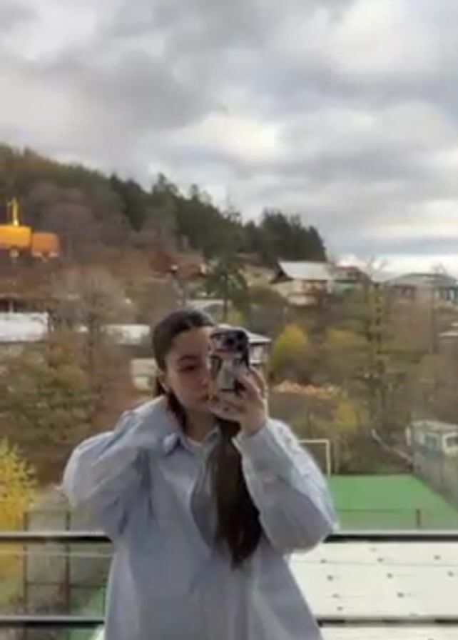 A young woman is standing on a balcony, taking a selfie with her phone. She is wearing a light blue oversized shirt over a t-shirt. Her long brown hair is parted in the middle and pulled back into two low ponytails. She is standing in front of a glass railing. Beyond the railing, there is a hillside with trees and buildings. In the foreground is a green field with a soccer goal. The sky is cloudy. The woman's phone has a case with images on it. She poses for the selfie.