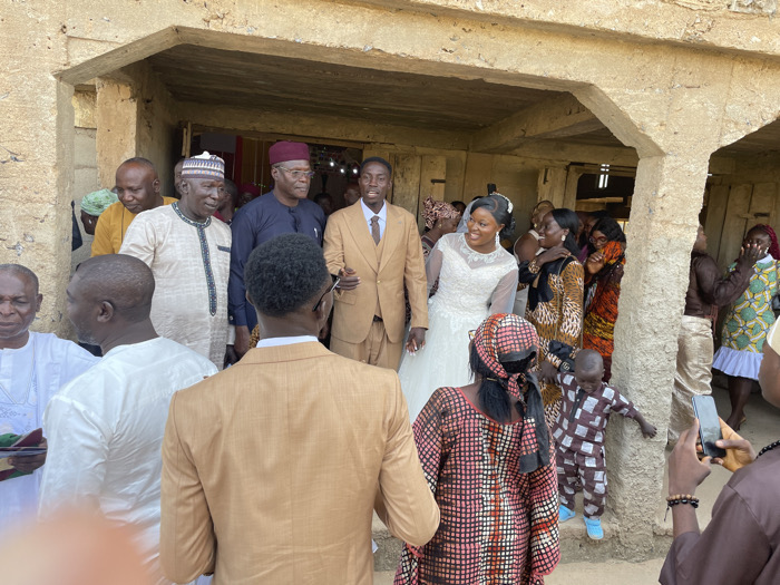 An outdoor scene in Rafin Par, Nigeria, depicts a wedding gathering in front of a building with rough, unpainted concrete or stone walls and exposed support pillars