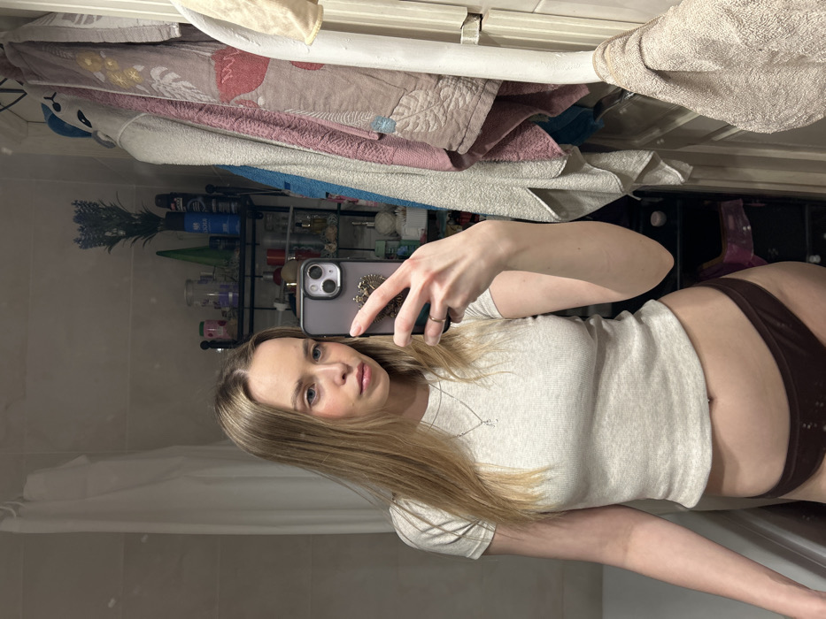 The image depicts a female individual's reflection in a bathroom mirror, located in Chaikovsky, Russia