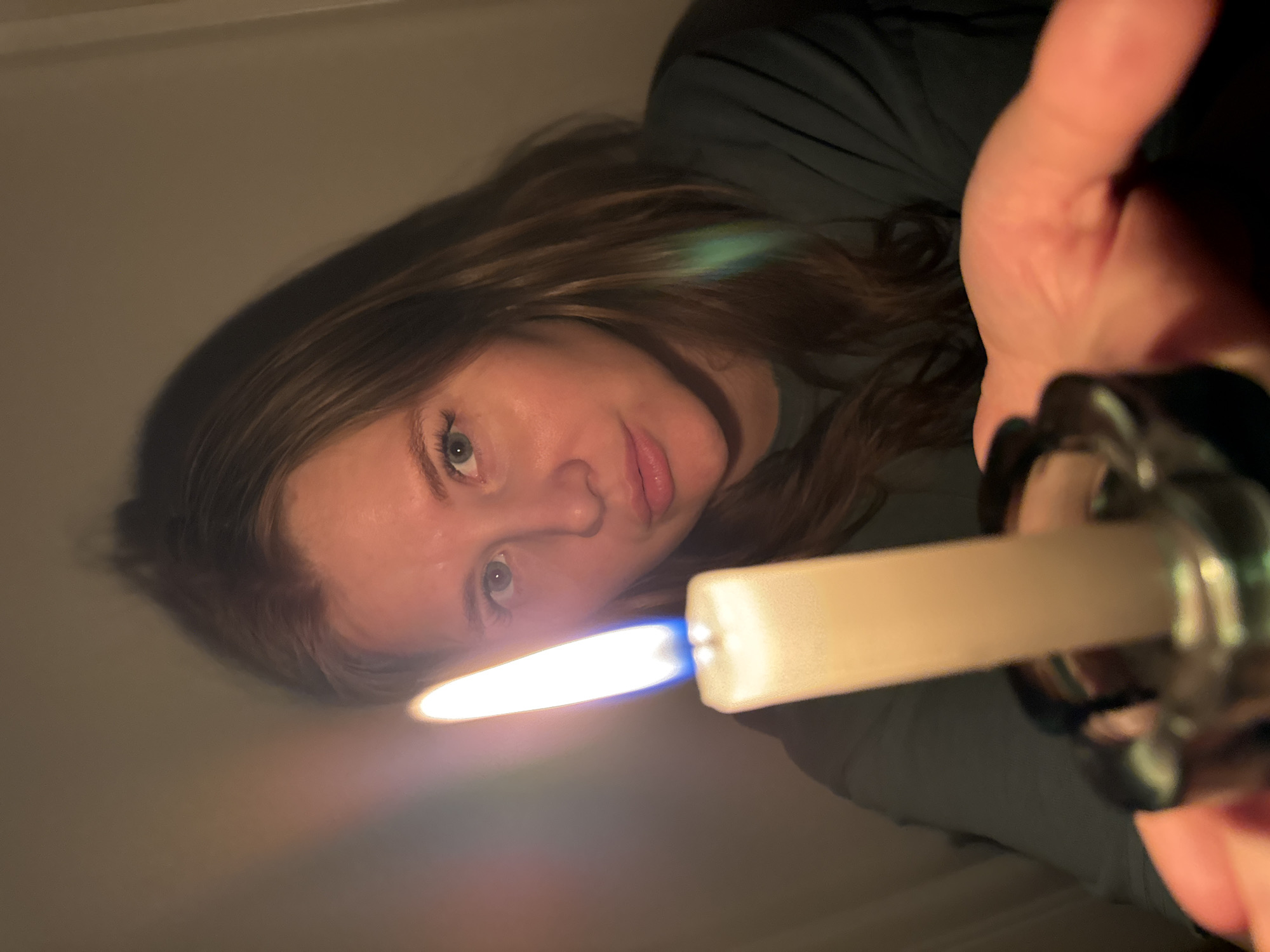 A woman is holding a lit candle in a silver candle holder. The candle's flame is bright, illuminating her face and the surrounding area. She is wearing a dark-colored shirt. The background is a neutral color, possibly a wall or ceiling. The image appears to be taken in a dimly lit indoor setting. There is no indication of the location being in Gornyi (Dvurechenskoe S/P), Russia from the visual information provided.