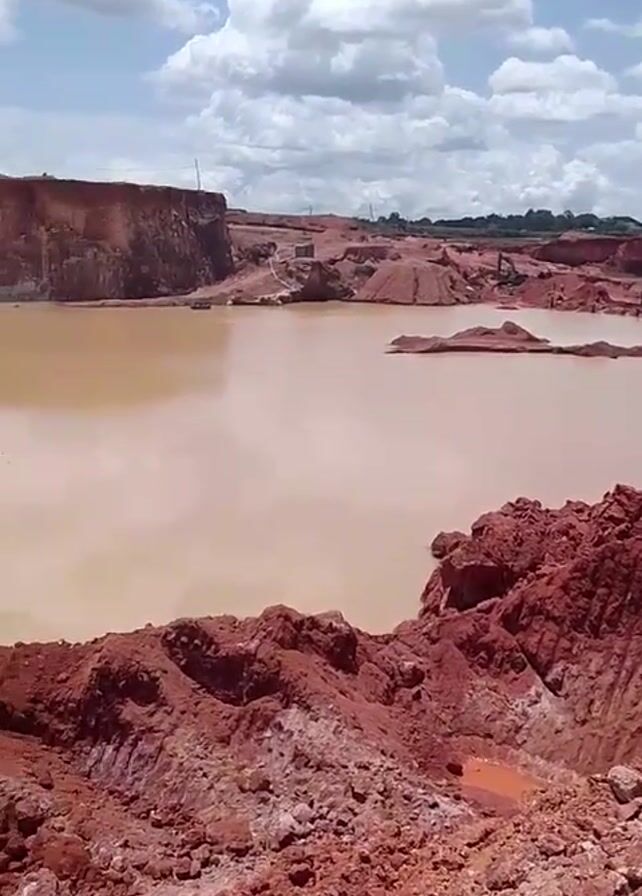 large, open-pit mine with red, earthen terrain. A body of murky, light-brown water fills the center of the pit, reflecting the sky. In the background, the pit edges are steep cliffs. An excavator is present on the edge of the pit, its arm extended. The sky is blue with scattered white clouds.