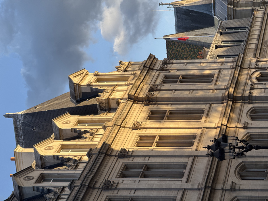 The image depicts a detailed view of a large, ornate building facade typical of 19th-century Parisian architecture, illuminated by warm, low-angle sunlight. The primary structure features multiple floors constructed from light-colored cut stone, displaying numerous rectangular windows with pronounced sills and decorative surrounds. Above, a prominent dark slate mansard roof incorporates multiple decorative dormer windows, each topped with a pediment and flanked by intricate carvings. Strong sunlight from the left casts defined shadows, accentuating the architectural relief. In the lower-left foreground, a traditional black wrought-iron streetlamp with three luminaires is visible. To the right, further back, a French flag (blue, white, red vertical stripes) flies from a flagpole on an adjacent building, which features a distinctive patterned roof, possibly of green and dark tiles. A partial inscription "A DES SCIENCES APPLIQUEES" is visible on a frieze of a building located below and to the right of the flag-bearing structure. The sky above is partly cloudy, with patches of blue visible amidst large, dark grey clouds. The location is Paris, France. Based on the distinctive Haussmannian architectural style and the visible text "A DES SCIENCES APPLIQUEES", the scene is identified as part of the Conservatoire National des Arts et Métiers (CNAM) complex, likely along Rue Saint-Martin in the 3rd arrondissement. No people or specific actions are visible in the frame.